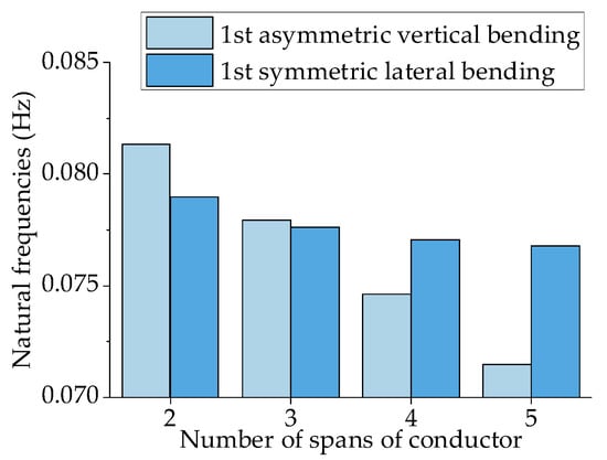 FE models were established to calculate the frequency of CRSTI, and a comparison was made between the natural frequency of the same mode of vibration of CRSSI and CRSTI. The natural frequency of each mode of vibration is shown in Table 2. The calculated results were plotted on a line graph, as shown in Figure 17. For the first symmetric lateral bending, the natural frequency of CRSTI was higher than CRSSI in the two spans. The opposite was true when the number of spans was higher than two. For asymmetric vertical bending, the natural frequency of CRSTI was lower than CRSSI. According to the results, an increase in the number of spans caused a decrease in the stiffness of the structure, which led to a decrease in the natural frequency. The decrease in structural stiffness was not linear. As the number of spans increases, the reduction in structural stiffness decreases with an increase in span. Compared with CRSSI, the decrease in stiffness for CRSTI was more pronounced with an increase in the number of spans. This indicated that CRSTI was more sensitive to the number of spans. In the case of CRSSI, the crossing of conductors at lower frequencies led to structural damage or short circuits in the transmission line, resulting in economic losses. Therefore, in practical construction, the selection of an appropriate system should align with diverse requirements related to topography and engineering considerations.
