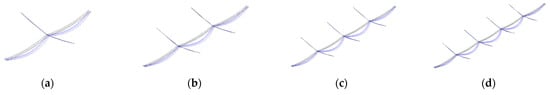 , , , and were plotted as a line graph in Figure 22. was approximately half of . The reason for this was that maximum horizontal displacement for the conductor was at the midpoint of the conductor. The increase in increased the displacement of one end for the conductor, while the other end of the conductor did not change. Thus, based on conditions of geometry, the increment of was approximately half of . So, was approximately half of . The larger resulted in a larger , and the horizonal displacement of the CRS system increased. In summary, a longer SI resulted in lower frequency and greater displacement, while a shorter SI posed a risk of discharge and made construction more challenging. Consequently, the length of the SI must be constrained within reasonable limits.