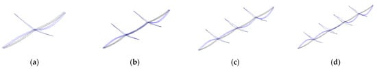 The 1st asymmetric vertical bending (Black: undeformed, Blue: deformed): (a) 2 spans, (b) 3 spans, (c) 4 spans, (d) 5 spans.