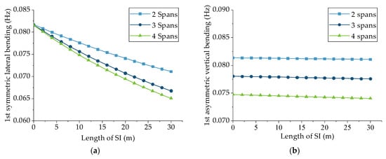 Influence of insulator length on the natural frequency: (a) 1st symmetric lateral bending; (b) 1st asymmetric vertical bending.
