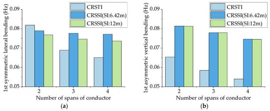 Comparison of natural frequency between CRSSI and CRSTI: (a) 1st symmetric lateral bending; (b) 1st asymmetric vertical bending.