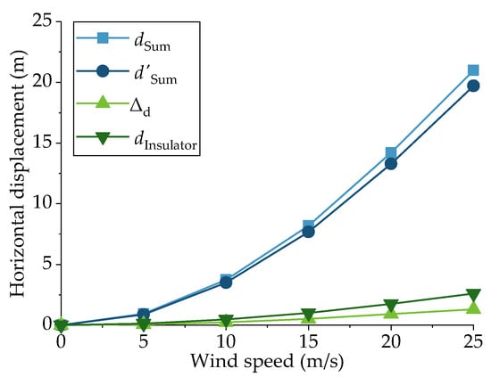 In Table 3, is approximately equal to , which means the displacement of the suspension cable had a small influence on the increment in displacement. On the contrary, the displacement of the insulator could not be ignored. To analyze the reason for the increment in displacement, was calculated: