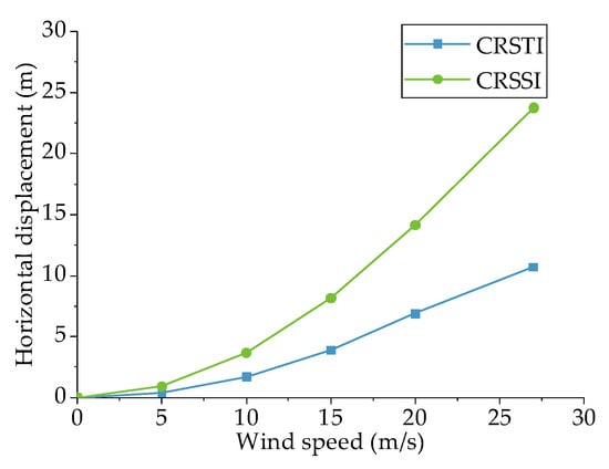 A static wind load was applied to obtain the horizontal displacement of CRSTI, and a comparison between CRSTI and CRSSI was made. The displacements of the conductor under different wind speeds for the two systems are shown in Figure 23. It was summarized that horizontal displacements of the conductor were increased with the increase in wind speed in the two systems. Further, the horizontal displacement of CRSSI was higher than that of CRSTI. The reason for this was that under the same condition of wind speed, for CRSSI, the wind load acted not only on the conductor and the cable but also on the insulator. The increment in the displacement caused by the insulator needed to be considered, which led to the displacement of CRSSI being higher. In practical application, an excessive lateral displacement led to a distance between the conductor and the cable that fell below the safe space, posing a risk to the integrity of the transmission structure.