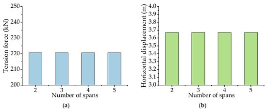 Different numbers of spans were used to study their influence on the tension force of the suspension cable and horizontal displacement. The results are shown in Figure 24. As shown in Figure 24, the increase in the spans had no effect on the tensile force of the suspension cable and the horizontal displacement of the conductor. The same calculation was used for CRSTI, and the results are shown in Figure 25. The calculation results were similar for both systems, and the number of spans had no effect on the two systems. In the case of horizontal displacement, an increase in spans not only raised the wind load on the structure but also added weight to the entire system. As a result, the incremental increase in horizontal displacement could be disregarded for both structures. Regarding tension force, the conductors were connected to insulators or suspension cables, and an increase in span had no influence on the individual conductor, resulting in the constancy of tensile force on both structures.