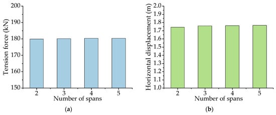 Influence of number of spans of conductor for CRSTI: (a) tensile force of suspension cable (b) horizontal displacement (wind speed = 10 m/s).
