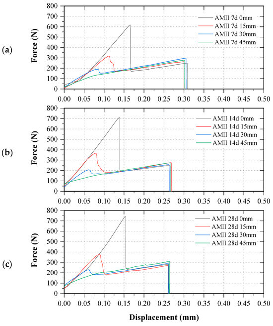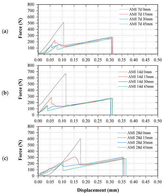 Sample propagation curves depending on the types of AM at different curing times: (a) 7 days, (b) 14 days, and (c) 28 days.