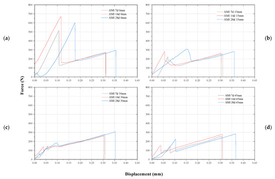 Figure 13 shows the results of the MMF test depending on the type of adhesive mortar. The analysis of the representative curves seems to indicate that the AMII mortar presents slightly better mechanical performance than the AMI, for all curing times evaluated. However, when taking into account the load values of all samples, the application of the Mann–Whitney statistical test, used when wanting to compare two groups of independent samples (AMI and AMII), indicated a pvalue > 0.05, which means that the hypothesis of equality between the average values must be accepted, that is, it is much more likely that the mechanical performance of the two mortars is similar.