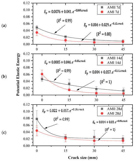 Elastic energy of the samples as a function of crack size: (a) 7 days, (b) 14 days and (c) 28 days.