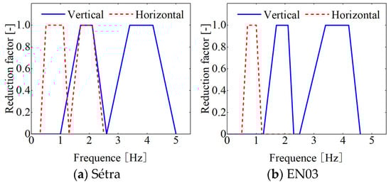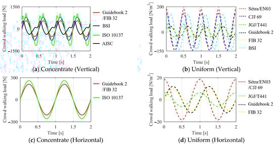2) uniformly distributed across the bridge deck. It employs a cosine wave load model to calculate the human-induced vibrations response and is applied to the structure for a particular mode shape. Additionally, both the vertical and horizontal walking loads consistently account for the first second-order dynamic load factors. The load model used in EN03 is similar to Sétra’s, but the horizontal walking load exclusively takes into account the first-order dynamic load factor. Among them, the crowd amplification factor is obtained by multiplying the equivalent crowd density and the non-resonant reduction factor