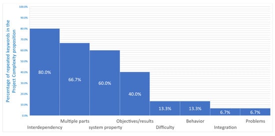 The literature contains many different definitions of project complexity (as shown in Table 3). One definition suggests that a project’s complexity involves many separate systems that must be linked together for completion []. In turn, according to Luhmannian systems theory, a project’s complexity results from the differences in function among its participants, the interdependence of its systems and subsystems, and the effects of any decisions made []. For Hass [], project complexity makes it challenging to manage due to its size, complicated interactions, or uncertainties. Furthermore, Vidal et al. [] propose that project complexity is the characteristic of a project that makes understanding and controlling its behavior difficult, even with complete project system information. Remington and Pollack [] asserted that a complex project possesses several characteristics at a particular level that make it very challenging to predict the project’s outcomes, management, or control []. In addition, project complexity comprises many elements of varied nature that constitute many interactions and flows between these components []. Additionally, Remington and Pollack [] described project complexity as complex systems formed from many elements with emergent behavior. These systems contain interrelationships and feedback between increasing numbers of areas of uncertainty and ambiguity. Moreover, complexity in projects consists of the interrelatedness, differentiation degree, and consequential impact of project elements on the decisions of the project []. San Cristóbal et al. [] affirmed that project complexity can be summarized by the following: differentiation (number of elements in a project) and interdependencies and connectivity (degree of interrelatedness between these elements) which are managed by integration, that is, by coordination, communication, and control [,,]. As shown in Figure 5, the data analysis revealed that the most significant concepts were those of interdependency (80%), multiple parts (66.7%), and system property (60.0%).