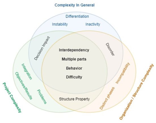 Nevertheless, there is still no agreement on a clear definition of complexity or its sources [,,]. This is because complexity science is still a new topic in general and in construction in particular [,]. Another reason for the lack of consensus might be the different focus by researchers as some adopted a definition for the word “complexity” from its general meaning [,,,,], while others focused on the analysis of complexity in organizations or systems [,,,,,,].