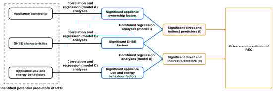 Simple regression models were used first, using a stepwise method [23] to find the significant predictors of REC for each category of factors, including not only direct effect factors, namely appliance ownership (AO) factors (model A), and appliance use and energy behaviour (AUEB) factors (model C), but also indirect effect factors, namely dwelling, household and socio-economic (DHSE) variables (model B). Following this, the identified significant predictors of the three defined categories (A, B and C) were introduced into two combined regression models. The first combined model (I) used DHSE and AO factors that were found to be significant in the previous simple models (A and B), while the second model (II) used DHSE and AUEB factors (B and C). The two combined models were built separately to provide more insights into the effect of appliance ownership and use, and the amount of variation in the REC that they can explain when investigated separately. This aspect was undertaken as the existing literature lacks comparative studies on these two elements.
