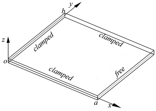 Rectangular orthotropic thin plates are increasingly being utilized in various engineering fields due to their outstanding mechanical performance such as the high stiffness-to-weight ratio and strength-to-weight [,,]. Among the mechanical investigations of such structures, vibration problems have attracted continuous attention since they commonly cause early failure [,,]. Within the framework of classical plate theory, the governing partial differential equation (PDE), as well as the boundary conditions, have been well established for a long time. Consequently, researchers have mainly focused on the solution methods of various plates. The solution procedure for plate problems falls into two categories: numerical/approximate approaches and analytical approaches. However, based on the authors’ knowledge, precise mechanical analysis for plates subjected to different edge restraints, no matter numerical/approximate or analytic solutions, are far from complete.