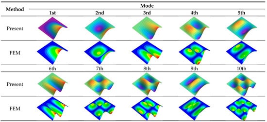 All the non-dimensional natural frequencies obtained by the present method and the finite element method are listed in Table 1 and Table 2. Analysis of these data reveals a consistent trend wherein increasing aspect ratios lead to a decrease in natural frequencies across both isotropic and orthotropic materials. Notably, a minimum in natural frequency is evident at an aspect ratio of 0.5. Moreover, a rapid decline in natural frequency is observed as the aspect ratios transition from 0.5 to 1 and 1.5. Subsequent increases in aspect ratios, particularly from 1 to 5, exert a minimal impact on the natural frequency. Interestingly, the results emphasize that an aspect ratio of 0.5 employs a more pronounced influence on natural frequency compared with ratios ranging from 1 to 5, irrespective of the material type. Furthermore, the comparative analysis between isotropic and orthotropic materials for identical boundary conditions indicated that isotropic materials consistently exhibited higher natural frequencies. This disparity sheds light on the inherent mechanical differences between isotropic and orthotropic materials, emphasizing the importance of material selection in engineering applications to achieve desired performance characteristics. Through Table 1 and Table 2, it is also evident that the percentage errors between the present solutions with the FEM data are no more than 1%. The corresponding deformation shapes for isotropic/orthotropic square plates are given in Figure 2 and Figure 3. Through Figure 2 and Figure 3, it is evident that the obtained plate deformation shapes strictly satisfy the edge conditions. Through the above comparison, it was found that all the given numerical and graphical solutions were very close to the FEM solutions, which provides sufficient evidence to exhibit the validity of the present approach and the precision of the analytical results acquired.