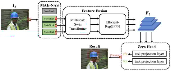 This section describes a fast and robust safety helmet detection network (FRSHNet) for carrying out real-time supervision of construction sites. Our FRSHNet consists of three main components: (i) Feature extraction based on MAE-NAS; (ii) feature fusion based on a multiscale Swin Transformer and efficient-RepGFPN; and (iii) loss function. The overall procedure of our FRSHNet is shown in Figure 2.