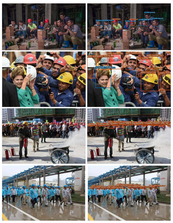 We estimated the performance of FRSHNet on the Pictor-v3 and SHWD datasets and compared it with seven state-of-the-art target detectors: Faster R-CNN [], Retina-Net [], SSD-512 [], YOLO-v5 [], FCOS (Fully Convolutional One-Stage Object Detection) [], VF-Net [], and TOOD []. Table 1 presents the performance of different methods on Pictor-v3 and SHWD datasets. FRSHNet outperformed the other approaches on the Pictor-v3 and SHWD datasets, reaching the highest mAp (Pictor-v3, mAp (0.5) and mAp (0.5:0.95): and ; SHWD, mAp (0.5) and mAp (0.5:0.95): and ), respectively. For the Pictor-V3 dataset and SHWD dataset, TOOD yielded a better performance, as well as a mAp (0.5, Pictor-V3) and a mAp (0.5, SHWD) of 91.50% and 86.70%, respectively. Figure 4 and Figure 5 present some examples of experimental results on the test set.