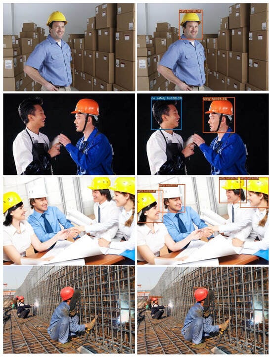 In future work, we will carry out the following related work: (i) dataset diversity and real-world testing, including images from monitored construction sites with varying lighting and weather conditions, to enhance the robustness and practical applicability of the proposed method; (ii) model optimization for energy efficiency and reduced computational load, considering that it is crucial for real-time applications and possible deployment on portable devices with limited processing capabilities; and (iii) expand the model’s capabilities to detect other types of personal protective equipment, such as safety vests and goggles, for comprehensive workplace safety monitoring.