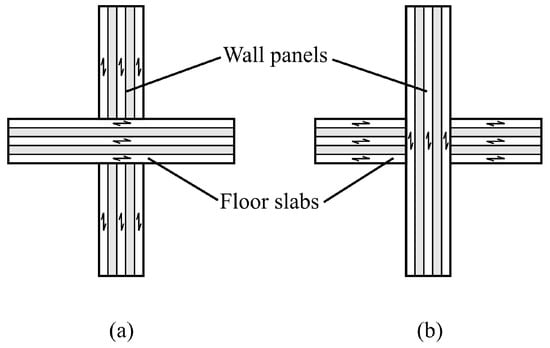 Due to its fibrous structure, timber exhibits anisotropic stiffness properties, with significantly higher stiffness along the direction of the fibres. The material properties are commonly assumed to be transversely orthotropic. Despite the pronounced disparity in stiffness between the radial and the tangential directions, engineering applications often assume equal properties in these two directions. This assumption is primarily rooted in the considerably higher stiffness along the grain. For Norway spruce, the stiffness in the radial direction is approximately 1.5 times higher than in the tangential direction [], while the stiffness along the grain is 20 to 30 times higher []. Depending on the installation of the floor slabs, a distinction is made between the platform frame and the balloon frame types of construction (see Figure 1). The difference between the along-the-grain and the perpendicular-to-the-grain material properties becomes an important factor in the platform frame CLT buildings, where floor slabs are compressed in the perpendicular-to-the-grain fashion. Due to the lower strength, inelastic deformation perpendicular to the grain is observed under high vertical loads []. While such loads do not lead to structural failure [], they may cause deformations significant enough to damage non-structural elements such as plasterboard or façade. Considering the stiffness of the building in the vertical direction, floor slabs have a substantial impact despite their small thickness compared to the height of the walls. To illustrate this, four cases are presented in Figure 2. In case (b), inserting a perpendicularly oriented interlayer between two walls reduces the overall vertical stiffness compared to case (a). A simple example [] demonstrated up to 50% reduction, assuming the commonly used dimensions for slab thickness and wall height. When the floor slab width exceeds the wall thickness, as in case (c), the overall vertical stiffness increases due to the stress dispersion under the wall []. Stress dispersion angles of 45° and 15° in the direction parallel and perpendicular to the grain, respectively, were proposed []. Conversely, a significant decrease in stiffness was observed after the installation of a layer of vibroacoustic insulation under the walls [], as illustrated in case (d). Similarly, it was observed that a layer of vibroacoustic insulation decreases the stiffness in shear testing as well [].