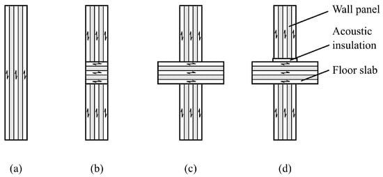 Different cases of vertical compressive load transfer: (a) a case of along-the-grain compression only, (b) a case where the width of floor slab layer is equal to the wall thickness, (c) a case where the width of floor slab layer is greater than the wall thickness, and (d) a case with a vibroacoustic insulation layer under the wall.