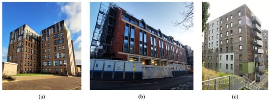 The observed building is a seven-storey CLT building, located in Glasgow, Scotland (see Figure 3a). It has an irregular T-shape with gross plan dimensions of and a height of 22 m. The load-bearing structure is of a platform frame type, and it features large monolithic CLT panels. The façade consists of a thin cladding imitating a masonry wall on timber battens. The internal walls are covered by plasterboards, and the building also features some partition walls. No vibroacoustic insulation is installed under CLT walls. A layer of screed is an important contribution to the total mass of the building.