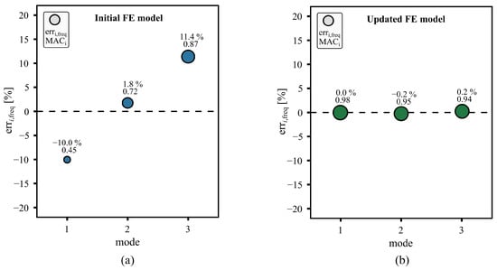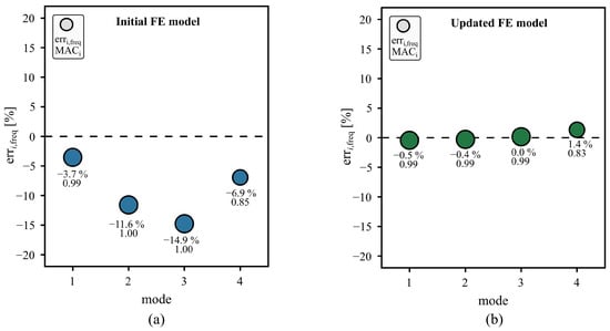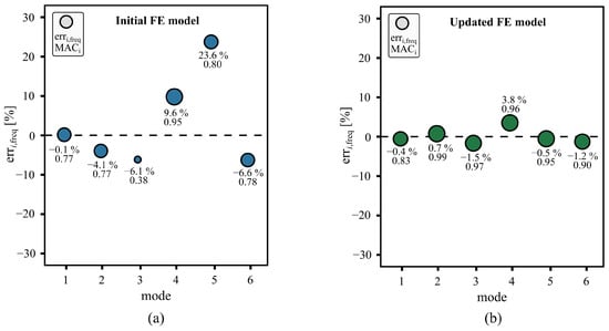 To improve the initial model, the updating of six parameters was performed. The objective function in the deterministic model updating combines the relative difference of experimental and numerical natural frequencies and the MAC values for a measure of the mode shape correlation. The updated model shows a vastly improved correlation with the measured modal properties, which is shown in Figure 4b. The building, experimental setup, modal identification, modelling, and model updating are presented in more detail in [].