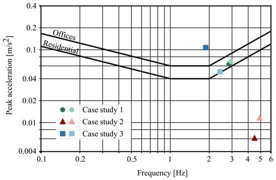 The computed values of peak accelerations are compared to the maximum allowed peak acceleration of ISO 10137; see Figure 7. The first case study just barely exceeds the limit curve for residential buildings. For a higher value of the assumed damping ratio, the design could satisfy the criteria of ISO 10137. The second case study is well below the curve due to the lower height and higher mass. Interestingly, the second mode seems to have significantly higher peak acceleration values. Finally, the calculated peak accelerations of the third case study significantly exceed the proposed maximal values for the first mode.