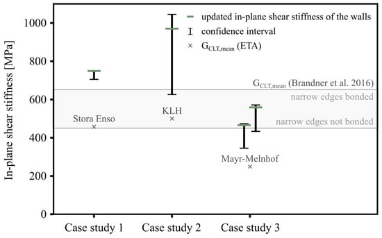 accounting for the effects of non-structural elements and the shear compliance of wall–floor connections, as well as the conservatively estimated shear modulus of the CLT panels. The updated parameter values of the three case studies are shown in Table 2, together with the impact of the updated parameter value on the natural frequencies. The impact of the parameter is computed as a relative change of the natural frequencies when the parameter is changed from the initial value to the updated value, while the remaining parameters take the updated value. It can be observed that the fundamental frequency is underestimated by roughly 10% to 20%, when non-structural elements are neglected. The effects on the second and third natural frequencies are similar. The updated values of are shown in Figure 8, where they are compared to the values of the in-plane shear moduli stated by the manufacturers of the CLT panels in their ETAs. The values of 650 MPa and 450 MPa that are proposed by Brandner et al. [] for the CLT, with or without the narrow edge bonding, respectively, are added to the plot as a reference. The procedure for obtaining the updated values and respective confidence intervals varied between the case studies. In the first and the third case studies, probabilistic model udpating was used. The updated values refer to the estimate of the maximum a posteriori, and the confidence intervals were obtained by taking the 5th and the 95th percentiles of the posterior distribution. In the third case study, the stiffness of the external and internal walls were separated into two parameters. The parameter corresponding to the external walls (on the right) resulted in approximately 20% higher values. The second case study was based on the deterministic model updating. Several iterations were repeated while changing the modelling assumptions. The confidence interval reflected the uncertainty of the model by changing the assumed mass of the building between 80% and 110% of the initial estimate. The updated value refers to the solution of the iteration with the initial building mass estimate. Details of the procedure are described in [].