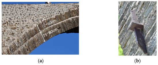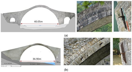 Comparison between Plaka bridge and Konitsa bridge (details of arch construction and of anchorage of iron connectors): (a) Plaka bridge—downstream view; (b) Konitsa bridge—upstream view.