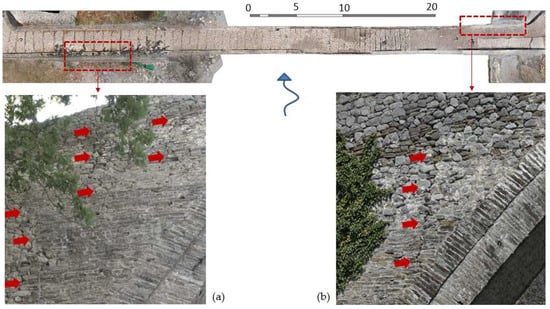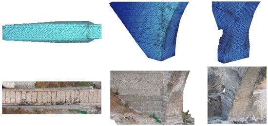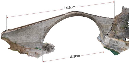 The documentation plan [] included the following: (a) the collection and evaluation of historical data, including its “structural history”; (b) a geometrical survey, using conventional and photogrammetric techniques (Figure 3, []); (c) a survey of morphological characteristics and identification of the bearing system of the bridge, using georadar scans and observation through borescopy; (d) the sampling of materials and laboratory tests to identify their chemical and mechanical properties; (e) a geotechnical investigation; and (f) the investigation of the hydraulic and seismic conditions of the region affecting the bridge.