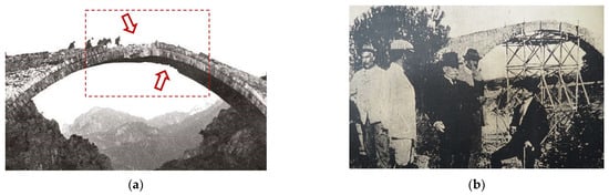 (a) The damage to the central part of the arch (photo by Rhomaides-Zeitz 1913 []), (b) photo (by unknown photographer) taken during the repair of the bridge by the French Army (courtesy V. Kaskanis).