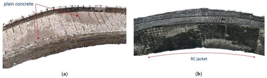 As aforementioned, there was an attempt to destroy the bridge by the retreating Ottoman army in 1913. Despite a significant loss of mass in the critical region of the arch (close to its crown, Figure 6a []), the bridge did not collapse. The engineers of the French Army that repaired the bridge the same year (Figure 6b) filled the holes due to the explosion with plain concrete (Figure 7a). This concrete is in good condition. Its compressive strength, based on the rebound technique, was estimated to be 50 MPa. The measured carbonation depth is limited []. In the same damaged region, at the intrados of the arch, there is an RC jacket (Figure 7b), in very poor condition. Laboratory tests on samples of the reinforcement of this jacket have proven that this intervention was part of the 1913 repair of the bridge []. Thus, the question arose about the structural function of this jacket. The answer to this question would guide decision-making on whether the RC jacket was to be removed or reconstructed using durable materials.