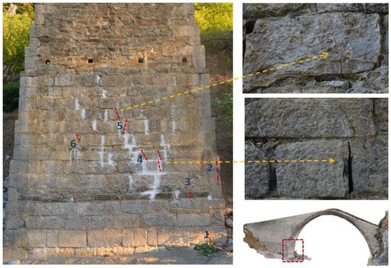 Figure 8. The inclined cracks (numbered 1 to 6) in the lower part of the south abutment of the bridge (region in the red square). - Cracks in the arch stones at the region of its springingAlmost vertical cracks are observed in the end stones of the main arch, at its intrados, in two locations, namely, in the downstream region of the south abutment, underneath the first transverse iron tie (Figure 9a), as well as at the base of the abutment (Figure 9b). Cracks of the same morphology are detected in the end stones of the arch, at the north abutment, in the region underneath the first iron connector (Figure 9c,d). In some cases, as shown in Figure 9c, there are stones detached from the arch.