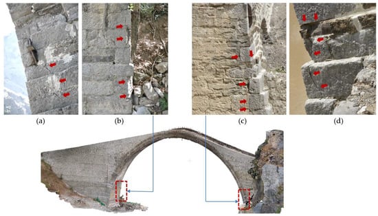 Figure 9. Damage (highlighted by red arrows) to the end stones of the main arch, at its lower part: (a) downstream of S-abutment, cracked stones at the region of the spring of the main arch; (b) cracked stones in the same region, at the base of the S-abutment; (c) upstream of N-abutment, cracked and detached stones at the spring of the arch, south view; (d) the same as in (c), view from upstream. - Vertical cracks in the spandrel wallsVertical cracks were surveyed by the authors in the upstream spandrel of the south abutment (Figure 10a), as well as in the downstream spandrel of the north abutment (Figure 10b) in the framework of a preliminary inspection, before the initiation of the detailed documentation.