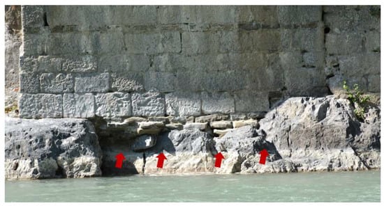 Figure 11. Stones are missing at the level of the north abutment foundation. - The state of the 1913 repaired regionThe major structural problem of the bridge is the poor condition of the RC jacket constructed at the intrados of the main arch, in the region of its crown (Figure 12), as part of the after-explosion repair of the bridge in 1913 []. The jacket, 100 mm to 120 mm thick, is provided with longitudinal reinforcement, consisting of eleven bars, 24 mm in diameter. Transverse bars, 14 mm in diameter were arranged, and spaced at approximately 150 mm. The grid of longitudinal and transverse bars is anchored to the arch, at its intrados, using steel hangers either wedged between stones of the arch or anchored to the plain concrete of the extrados. Smooth bars with handmade protrusions for an improved bond with the concrete were used. The RC jacket presents very advanced corrosion of the reinforcement, with a significant reduction in the bars’ diameter and disintegration of the concrete, as shown in Figure 13. Therefore, the structural function of the RC jacket is no longer fulfilled. To make a decision on whether reconstruction of the disintegrated RC jacket is needed, it is necessary to identify the reason for which that intervention was applied, and if its rationale is justified.