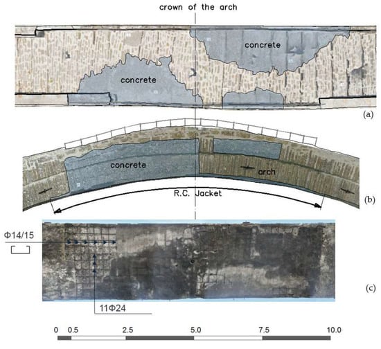 Figure 12. Geometrical survey of the after-explosion repair intervention: (a) plan; (b) upstream view; (c) view of the intrados of the arch. Scale in meters.