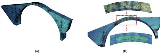 There are studies in which scaled arches were subjected to laboratory tests, while their behaviour was predicted through numerical calculations (e.g., [], where the specific case of the behaviour of arches against high-rate loads is investigated).