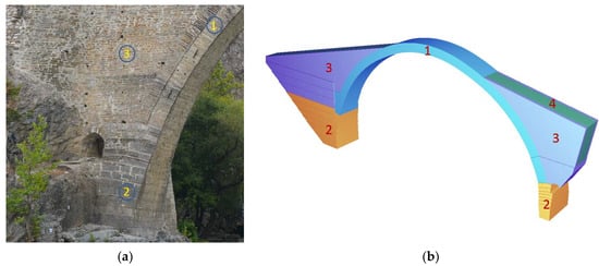 (a) Construction typology of masonry in various regions of the bridge; (b) 3D numerical model of the bridge—identified regions of masonry characterised by different geometrical and mechanical properties (view from upstream).