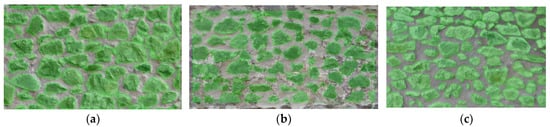 Calculation of stone area on the photogrammetric model for spandrel walls—construction with rubble stones: (a) upstream south area; (b) upstream north area; (c) downstream south area.