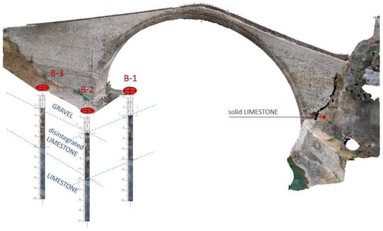 Upstream view of the bridge photogrammetric survey (Michaelidis []). The location of the geotechnical boreholes (B-1, B-2, B-3) and the respective findings are shown.