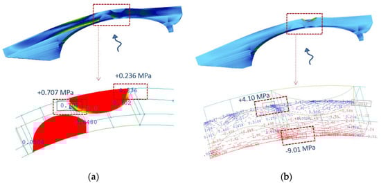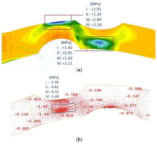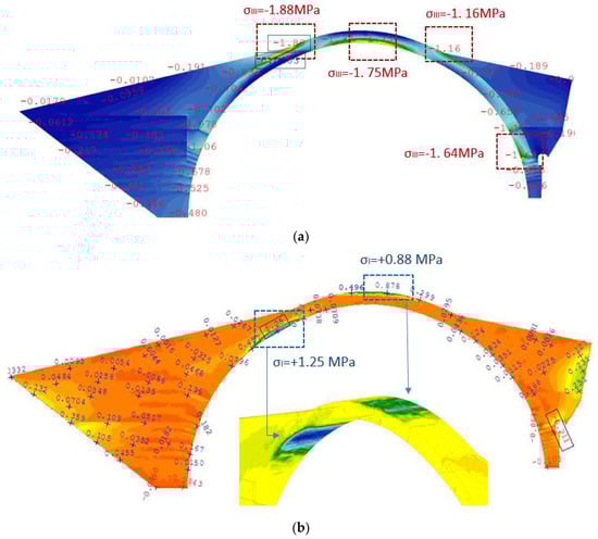 Results of numerical calculations for the damaged region of the bridge. Flow pressure for the 1000-year flood scenario. Principal stresses (a) when the RC jacket at the intrados is not included in the model, and (b) when the RC jacket is considered, while the portion of the plain concrete at the extrados being subjected to tension (as per Figure 33a) is not included in the numerical model.