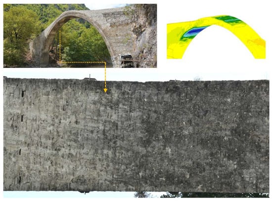 To obtain reliable data and to propose a credible and efficient scheme of interventions for the preservation of the bridge, exhaustive documentation of the bridge was planned and executed. As presented in [], the documentation included an investigation of the geotechnical conditions at the south bank of the river (the north abutment being founded on rock), the identification of the bridge’s structural system, the elaborate survey of its pathology, the application of in situ non-destructive investigation techniques to identify the typology of the masonry construction and the extensive sampling and laboratory testing of materials that were carefully selected from various regions of the monument. It is noted that the study of historical data related to the bridge did not allow for the time of construction of the RC jacket at the intrados to be identified.
