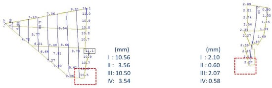 As shown in Figure 16a, the construction typology of the masonry is different in various regions of the bridge. Those regions, identified during the documentation of the bridge, were distinguished in the numerical model, whereas adequate material properties were adopted for each of them. As shown in Figure 16b, four regions are distinguished, namely, the arch (region “1”), the lower portion of the abutments characterised by a solid construction typology (region “2”), the spandrel walls (region “3”) and the filling material between the spandrel walls (region “4”). It is noted that although there is a distinction in the mechanical properties of regions 3 and 4, a perfect bond between the exterior walls and the filling material is assumed. This is because no sign of any detachment between the spandrel walls and the filling was detected, neither during the meticulous visual inspection nor during examination using the borescope.