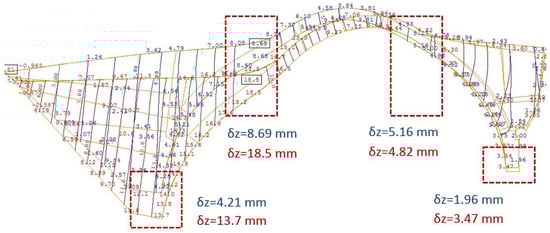 The filling of the damaged areas with concrete reinstated the integrity of the arch. Nonetheless, the deformations caused by the explosion are obviously permanent. Furthermore, as the repair of the arch was carried out without temporary shoring (Figure 6b), the added concrete (plain or reinforced) constitutes an additional self-weight. Actually, Figure 30 shows that the added concrete has caused a further vertical deformation at the crown of the arch, of limited value, though. Furthermore, Figure 31 shows a small decrease in the principal compressive stresses in the area affected by the explosion (comp. with Figure 29).