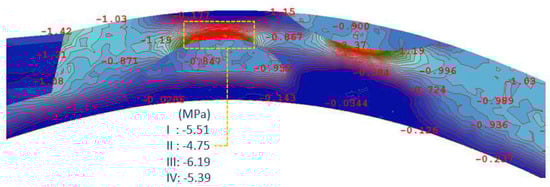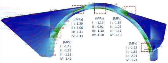 Phase 4—principal compressive stresses at the crown of the arch area after the 1913 repair.