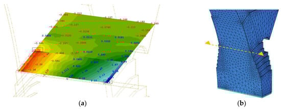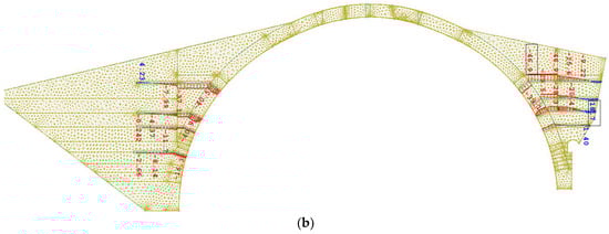 The bridge was modelled with the software SOFISTIK (ver. 14.14–30) [], using volume elements (Figure 14a) for masonry, shell elements for the RC jacket at the intrados of the arch (Figure 14b) and linear elements for the timber. The detailed geometry of the bridge was reproduced (Figure 15) based on its photogrammetric survey []. The parameters adopted for various parts of the bridge, as well as for the foundation, are presented herein. Vertical loads, mainly, the self-weight of the bridge, were considered, while, based on a hydraulic study, the accidental action of flood was accounted for. Finally, the behaviour of the bridge under seismic actions was also investigated.