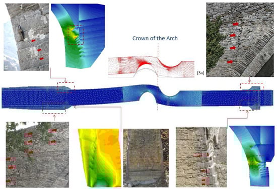 - Equivalent static analysis for the conventional seismic action resulting from the current Seismic Code, assuming a q-factor equal to unity. The conventional seismic action is imposed on the numerical model representing the repaired bridge, excluding the RC jacket. The results, presented in Figure 36, show that the tensile stresses developing in the damaged and, subsequently, repaired region of the arch are by far larger than any value that could be assumed for the bond between the arch and the added plain concrete. This proves that the RC jacket at the intrados, thanks to its longitudinal reinforcement, is needed to undertake the tension due to the transverse action of an earthquake. It seems that, on the contrary, the developed compressive stresses can be resisted by both the arch and the plain concrete. Another interesting, although qualitative result, is related to the tensile and compressive stresses calculated at the base of the two abutments. As shown in Figure 36, the tensile or compressive stresses develop in the same face of the two abutments. This is an observation that confirms the interpretation of the damage (presented in Section 6.3), attributed to the 1913 explosion. The numerical values of the compressive stresses at the base of the abutments are significantly smaller than the compressive strength of the masonry (=14.50 MPa, Table 1), while the tensile stresses seem to be far beyond the tensile strength of the mortar. Nonetheless, as shown in Figure 37, the peak tensile stresses occur in the smaller dimensions section of the north abutment, while they are very much localised;