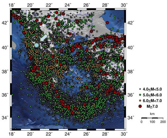 Epicenters of shallow earthquakes in Greece of magnitude Μ > 4 that occurred between 550BC and 2018AD []. The light blue circle shows the location of the bridge of Konitsa.