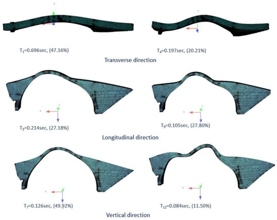 - Eigenvalue analysis, with the purpose of qualitatively identifying the most critical modes for the seismic behaviour of the bridge. To this purpose, the as-built bridge is modelled, before the 1913 damage. The results of this analysis are shown in Figure 35, where the modes with the most significant contribution are presented. The results show that the most critical direction is the transverse one, out-of-plane of the bridge, with the contribution factor of the translational first mode being close to 50%. This is the reason why only results concerning the seismic action in the transverse direction are presented herein. This is more so because the effect of the RC jacket at the intrados is investigated;