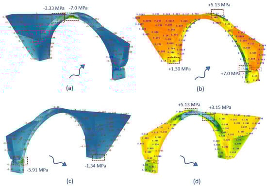 Figure 36. Principal stresses due to the seismic action in the transverse direction: (a) upstream face—compressive stresses; (b) upstream face—tensile stresses; (c) downstream face—compressive stresses; and (d) downstream face—tensile stresses.