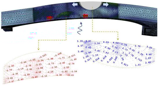 - In conclusion, the results of the numerical analyses, although oversimplified, allow for the structural function of the RC jacket to be qualitatively identified. As shown in Figure 38, during a seismic event, the portion of the unreinforced concrete at the extrados of the arch subjected to compression collaborates with the masonry arch, whereas the concrete portion belonging to the tensioned zone of the section risks being detached from the masonry arch. Therefore, it is sensible to assume that the RC jacket, thanks to its reinforcement, can prevent the occurrence of cracks in the tensioned zone or keep their openings to an acceptable value.